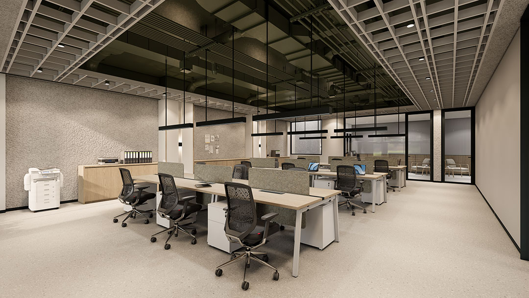 Designing an office space with executive desks, ergonomic chairs, and modern collaborative areas for a global technology team.